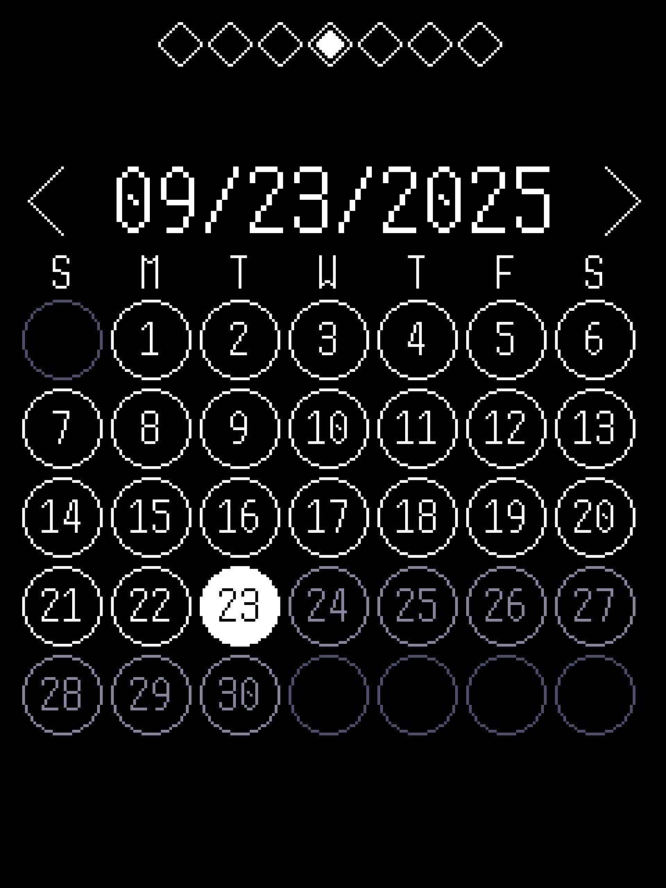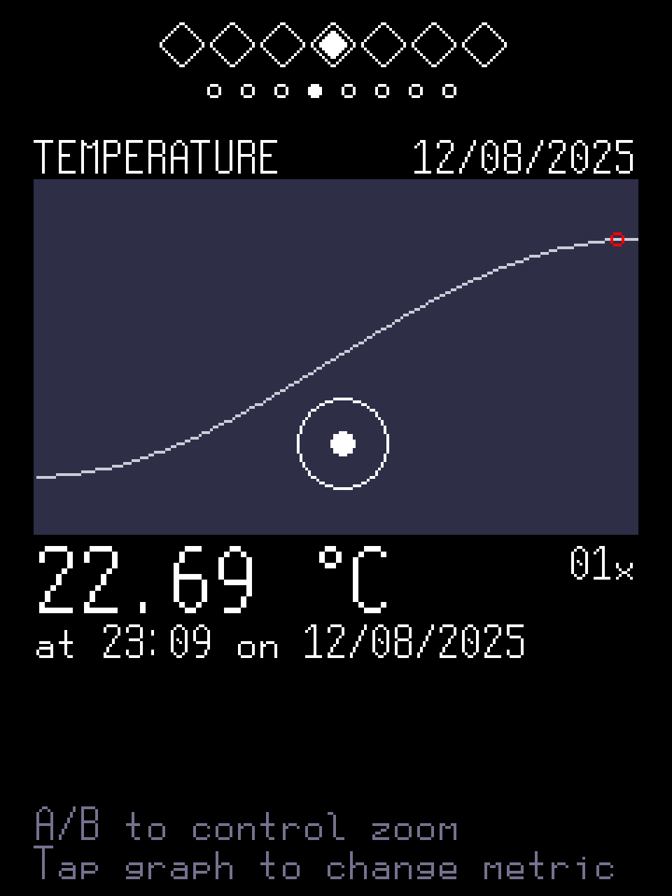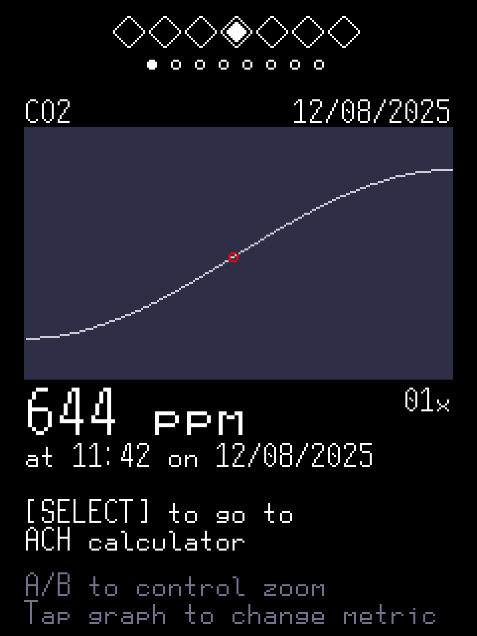 The calendar page, once opened, begins with date selection. When a date is selected, a graph of that date's logged air quality data is made available. The graph's cursor is moved with the D-pad. Zoom with A/B. Beneath the graph viewport, a readout of the hovered data is avaiable. To change which metric is being displayed, tap the graph viewport.