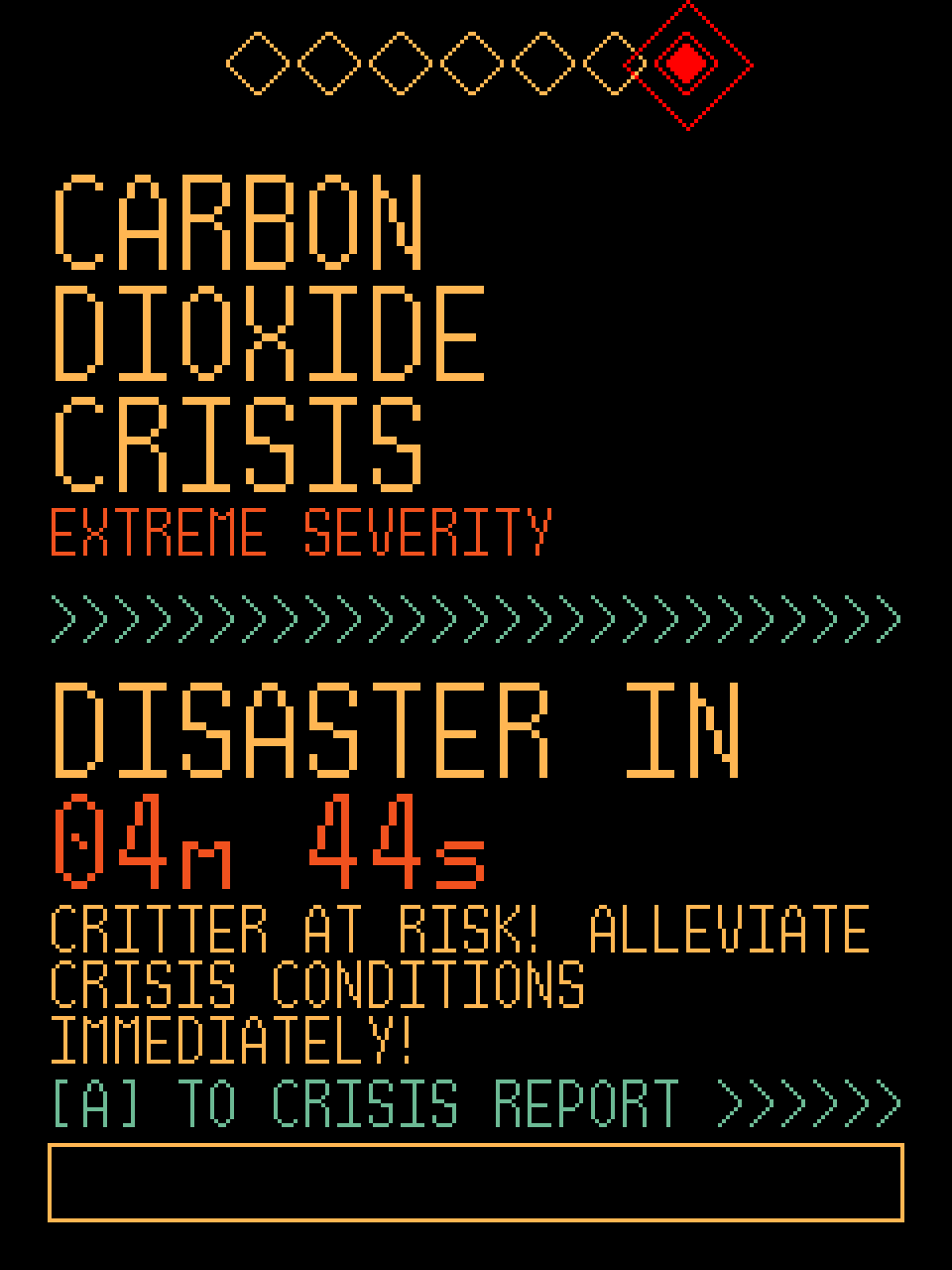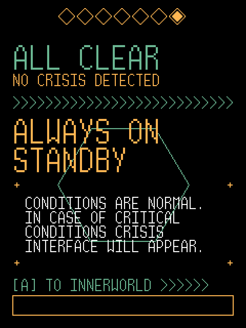 This page must be passed through to get to the apartment or, in the case of a crisis, the crisis report. In the case that a crisis occurs, this page will be highlighted and will give an overview of the crisis' nature. If no crisis is underway and all is well, the highlight will disappear and the page will indicate nominal status.