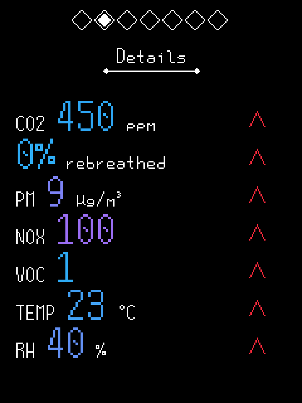 Here, real measurements with units can be viewed for all main air quality metrics. Measurement text is coloured to represent relative badness. To the right of each measurement is an arrow indicating if that metric is currently trending up or down.