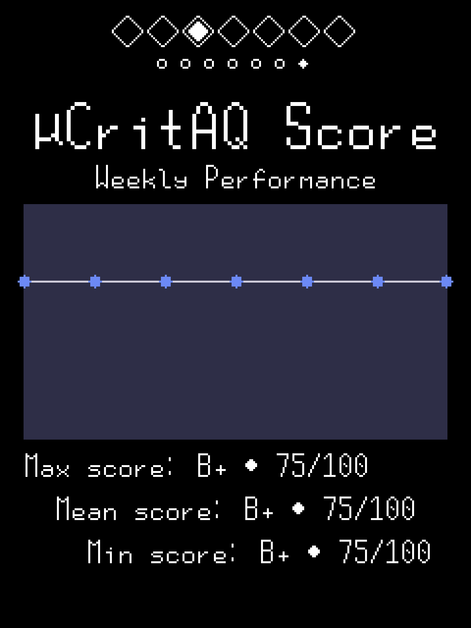 The sparklines on this page reach seven days into the past from present day. The plotted values correspond to grades, with grade goodness increasing along the Y axis. Below each sparkline is a readout of its maximum, mean, and minimum values. To change which metric is being dislayed, tap the sparkline viewport.