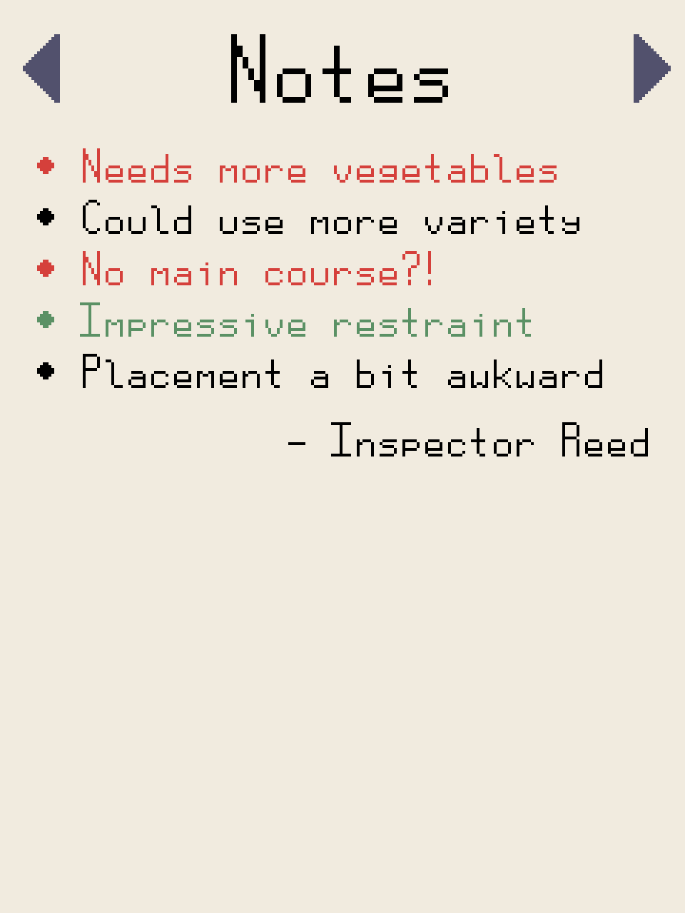 At a basic level, feeding consists of selecting food items from your inventory and arranging them into a meal on your critter's meal tray. Meals are judged by nutritional completeness and diversity, neatness of arrangement, and also style. Once a meal is submitted for your critter to eat, Inspector Reed will deliver some feedback on the meal. Use this feedback to inform the way you play the minigame.