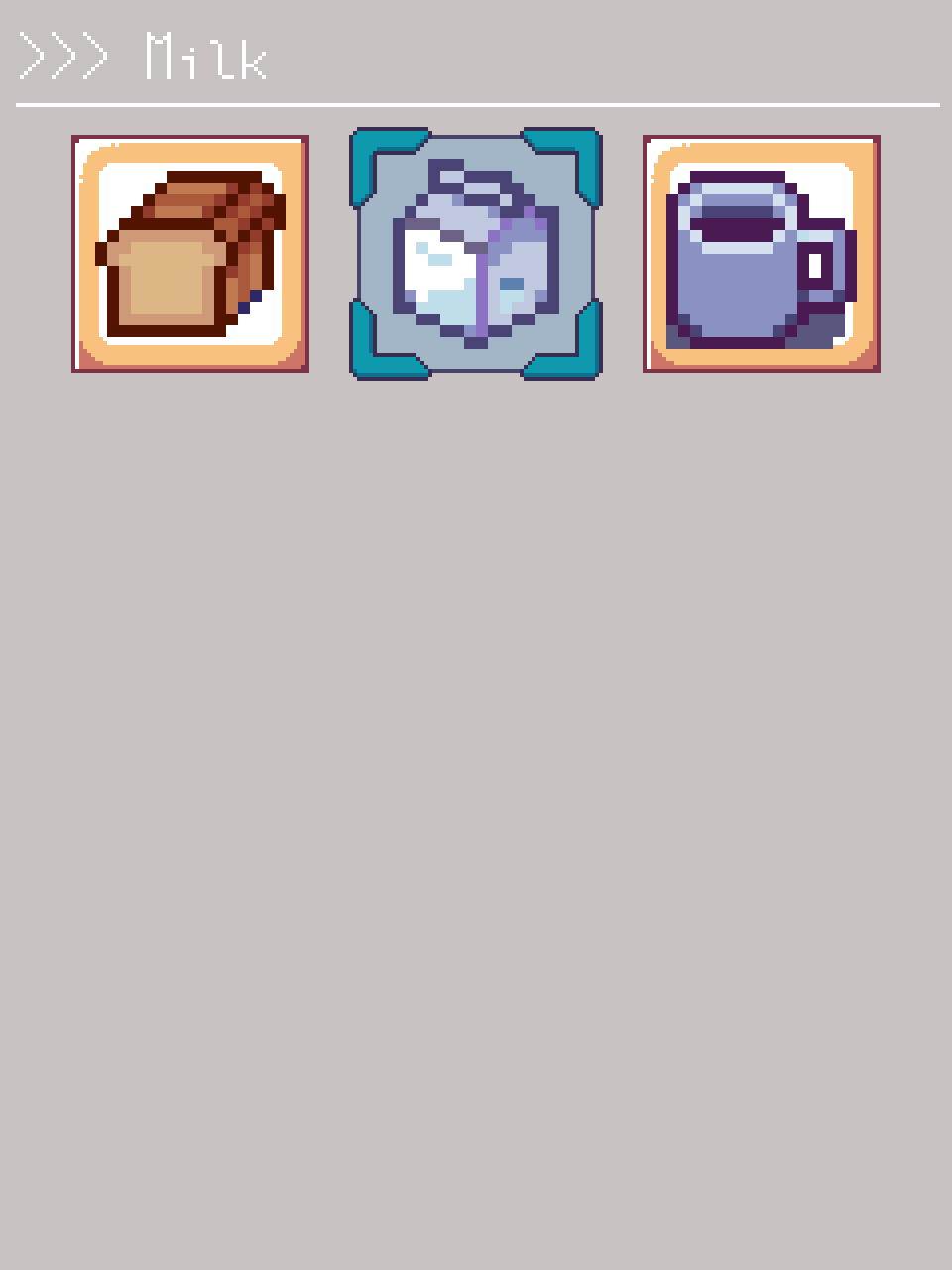 To open the inventory for selection, press the screen button with a rotor icon on it. Selected items will have a golden highlight around them. You may have up to 5 items selected at a time. Once you have selected the items you wish to work with, exit the inventory to see them on the counter above your critter's table. You may change which items you have selected at any time prior to meal submission.